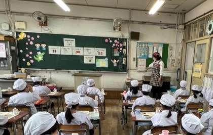 担任の先生から、給食カレンダーを通して、お祝い献立の説明がありました。みんなが大好きなカレーライスにトンカツを乗せていただきます。デザートは、和なしの缶づめとみかんゼリーを合わせたフルーツゼリーです。