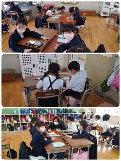 2年生は、今学期の係を決めました。その後、係で集まって係のカードを書いていました。担任の先生がお話を始めると、さっと静かになって先生の方を見ることができたので、いっぱいほめてもらっていましたよ。話し合う時の声の大きさについても確認して、グループで上手に活動していました。