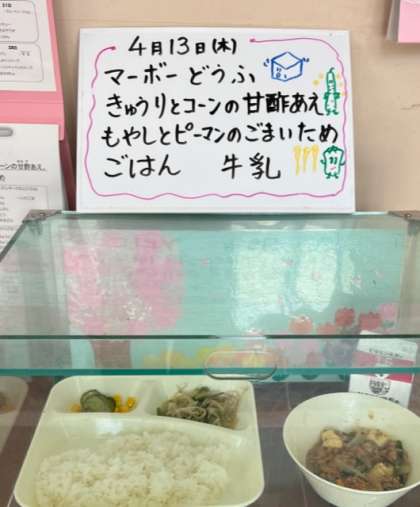 4月13日(木)今日の給食の献立は、「マーボーどうふ きゅうりとコーンの甘酢あえ もやしとピーマンのごまいため ごはん 牛乳」です。