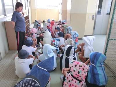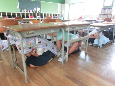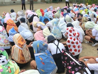9月4日(金)11時00分「地震発生!!」。教室の児童は、椅子の座布団として使用している「防災頭巾」をかぶって、机の下に避難【写真左】しました。その後、揺れがおさまったので全員が運動場に避難【写真中】しました。避難にかかった時間は、3分6秒でした。校長先生からは、学校だけではなく、もし家の中や電車・自動車の中で大きな地震にあった場合はどうするか、日ごろから考えておこうというお話がありました。