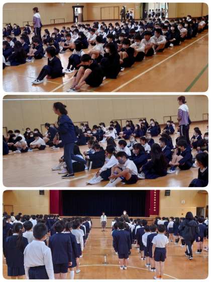 朝会が始まる前に、子ども達がどんどん講堂に集まってきました。どの学年もさっと整列し、座ってからもとても静かに待つことができていました。あまりの静かさに驚いたくらいです。