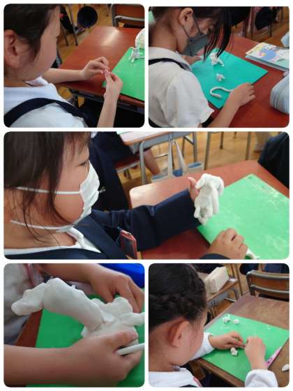 2年生の教室に入ると、粘土で自分の好きな動物を作っていました。子どもの近くに行くと、「これな、○○やねん。」と話してくれます。お友達の動物を見て、「すごいなぁ。大きいのん作ってるねんね。」「○○ちゃん、上手。」など、いいところを見つけて教えてくれる子もいました。人のいいところを伝え合えることができる学級は、どんどん仲間づくりができていきますね。