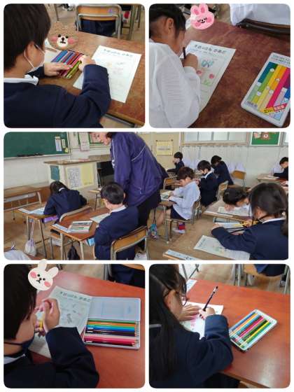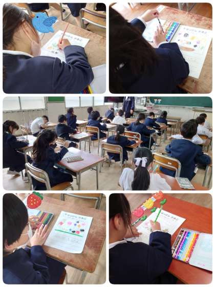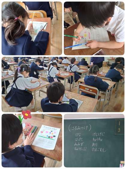 生活科の学習で、「はるみつけ」をしたときのことを思い出して学習カードにまとめていました。1年生の子ども達が見つけた春は、いろんなお花や虫です。みんなカードにがんばって絵を描いていました。カラフルなお花や虫でいっぱいになりました。