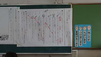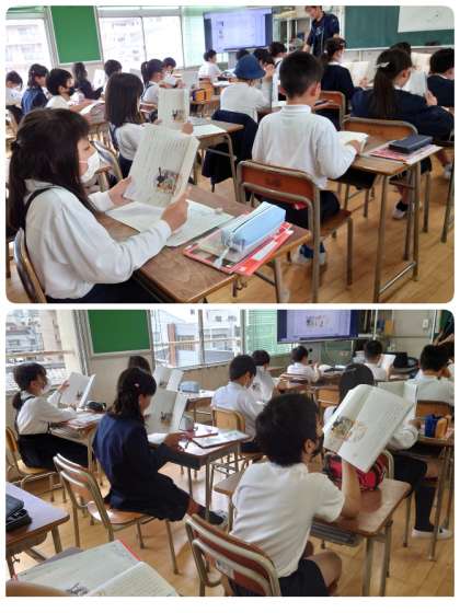 4年生は、国語の時間に音読をしていました。「こわれた千の楽器」というお話で、「想像したことを音読で表そう」が学習のめあてです。子ども達は文の内容を読み取って、それぞれの楽器がどんな気持ちなのかを想像しながら音読していました。音読に気持ちがこもっていて、それぞれの楽器の様子が目に浮かんでくるように上手に読むことができていました。