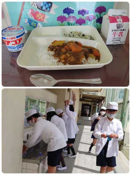 今日のメニューは、牛肉と大豆のカレーライス・キャベツのひじきドレッシング・ヨーグルト・牛乳でした。牛肉と大豆のカレーライスは、牛肉のうまみがよく出ていて大豆の食感もよく子ども達はもりもり食べていました。おかわりに行列ができていました。キャベツのひじきドレッシングは、さっぱり味でお口直しの一品でした。今日もおいしくいただきました。(*^-^*)