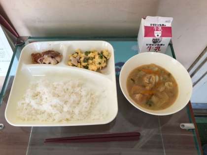 5月9日(火)今日の給食の献立は、「えんどうの卵とじ あかうおのしょうゆだれかけ みそ汁 ごはん 牛乳」です。