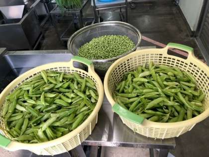 えんどうまめをさやからだして茹でます。こんなにたくさんのえんどうまめですが、みんなおいしく食べることができたかな。あかうおのしょうゆだれかけもごはんとよく合うと思います。みんなおかないっぱい食べてね。