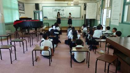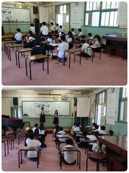 今日の音楽の時間にリコーダーのテストがありました。みんなで何回か練習してからテスト開始。舞台に上がってふたりずつ演奏しました。ちょっとドキドキの5年生。吹き終わったら必ず「がんばったね!」の拍手が起こる子ども達です。