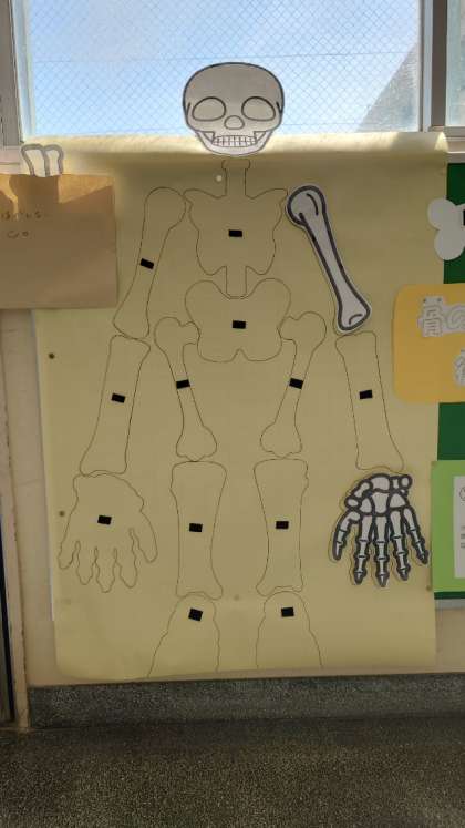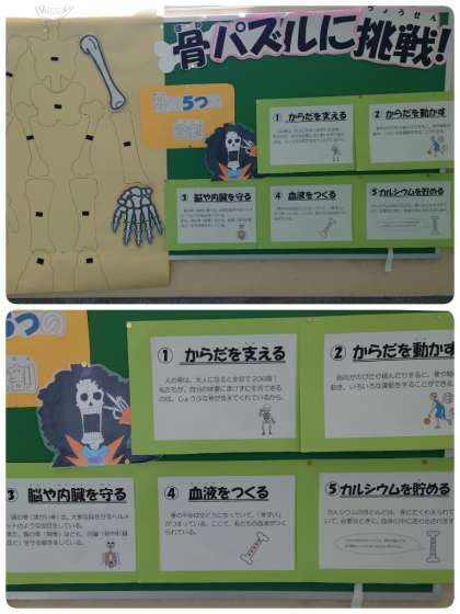 保健室の前の掲示板に「骨パズルに挑戦!」コーナーができています。骨の働きについてもわかりやすく書いてあります。