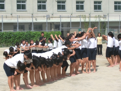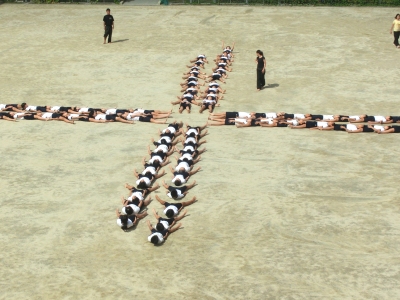 ポイントへの移動や隊列の組替えもスムーズにできるようになってきました。仲間を信じて大きな声をだし、曲のイメージに合わせ「気合がみなぎる組体操」です。こらからますます高度な練習になっていきます。一人一人のモチベーションがあがることで、より一層連帯感や力を結集することの大切さを実感していると思います。
