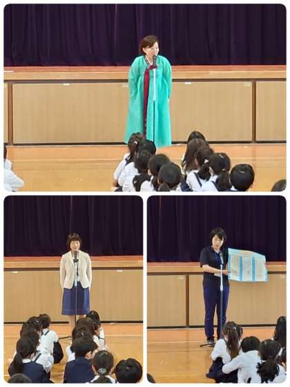 昨年度に引き続き中浜小学校に来ていただくことになったソンセンニムを児童朝会で紹介しました。今年度も、毎週月曜日の国際クラブ「チングの会」、そして全学年の子ども達に、すぐお隣の国の韓国・朝鮮の文化や遊び・楽器など、いろんなことを教えてもらいます。
