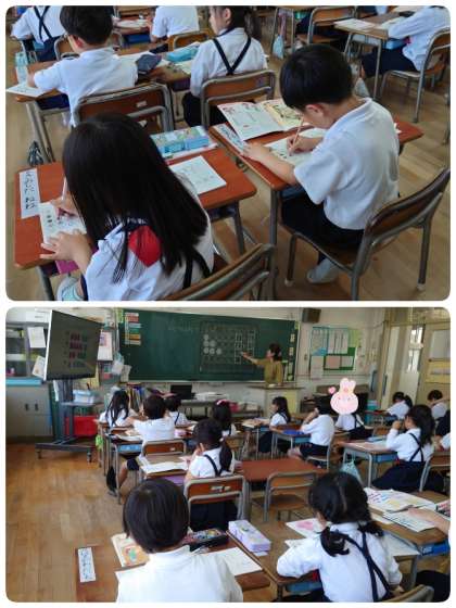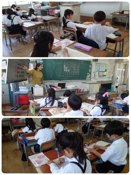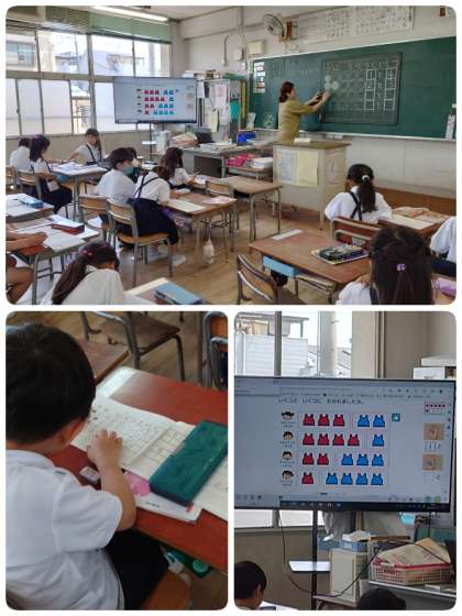 算数の時間に「いくつといくと」の学習をしていました。大型テレビに映し出された問題を見て、みんなで問題を確認。今日の問題は「5」です。「5は、1と4。5は、2と3。」とプリントに書いてある〇に色を塗りながら考えていました。しっかりがんばって学習できていました。
