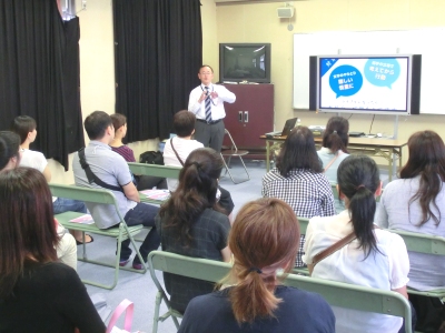 9月12日(土)10時、本校PTA成人人権委員会主催で「ケータイ教室 安心・安全講座」を多目的室で開催しました。子どもの携帯電話利用の拡大に伴い、「無料通話アプリ上のいじめ」や「有害サイト」を通じて子どもが犯罪に巻き込まれる危険性が、社会的問題となっています。