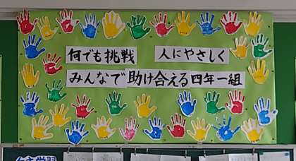 4年生の目標は「何でも挑戦」「人にやさしく」「みんなで助け合える4年1組」です。