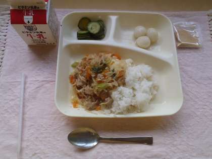 5月23日(火)今日の給食の献立は、「豚丼(ぶたどんぶり) 牛乳 きゅうりの梅風味 白玉だんごのきな粉がけ」です。