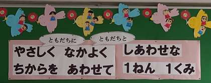 1年生の目標は「ともだちにやさしく ともだちとなかよく ちからを あわせて しあわせな 1ねん1くみ」です。いろいろなことに力を合わせて、みんながハッピーになる学級をめざしていきましょう。