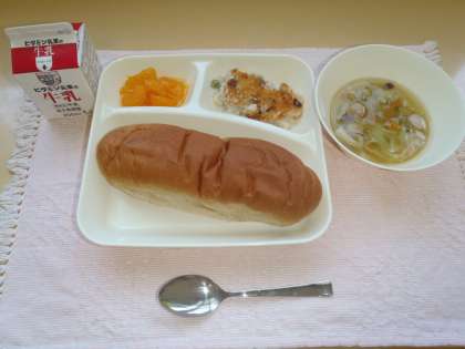 マカロニグラタンは、子どもたちに人気のある献立の一つです。いつもなら、「パンは一口大にちぎって食べます。」と言うのですが、「今日は、少し大きくちぎってグラタンをはさんでグラタンパンにして食べていいよ。」と言うと、小さなシェフたちが思い思いにグラタンパンを作って食べていました。