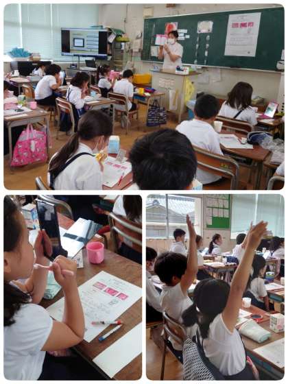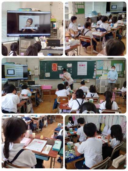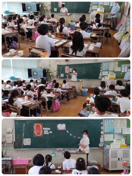 2時間目に歯みがきの学習をしました。2年生の子ども達は、ども達は体のお話が大好きです。興味津々で歯科衛生士さんのお話を真剣な表情で聞いていました。いよいよ染色液を使って自分の歯垢を調べます。鏡を見て自分の歯のどこに汚れがついているかチェックしました。歯ブラシを使って赤い色が取れるようにゴシゴシ。歯がつるつるになるまでがんばりました。きれいに歯垢が取れてお口の中もすっきりです。今日学習したことでこれからの歯みがきが上手になるとうれしいです。