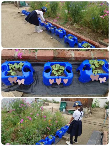 登校後、朝の準備ができた子からアサガオの水やりをしています。たくさん双葉が出てきて、アサガオの成長を楽しみにしている1年生です。