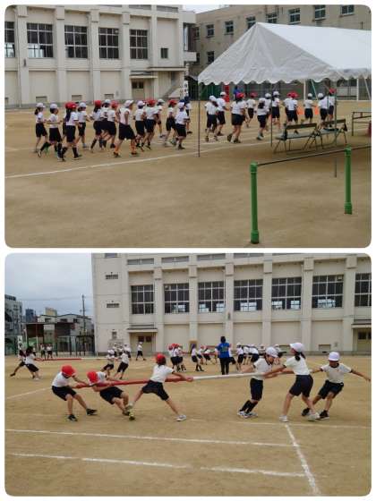 *写真は、4年生の団体競技「棒引き ひっぱれ!」と5・6年生の団体演技「Nakahama Dream the Ride−59人の最高を、お届けしたい。−」の様子です。