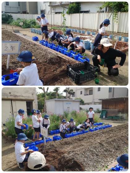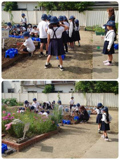 と言いながら、せっせと土を入れ苗を植え、お水をいっぱいあげました。しっかりお世話をしておいしいトマトができますように。(*^-^*)