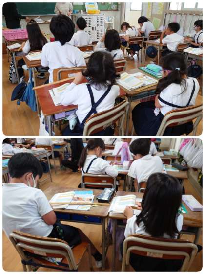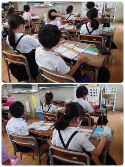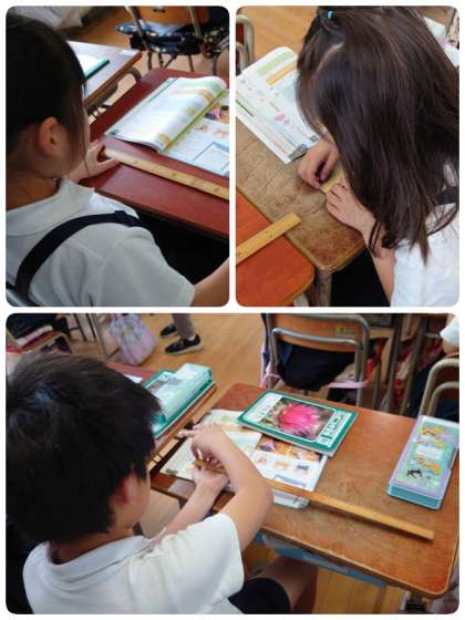 算数の時間に、竹ざしを使って1cmと1mmの長さの学習をしていました。普段あまり使うことがない竹ざしですが、長さを測る学習ために使います。1cmとは実際どのくらいの長さなのか、目で見て、指を使ってだいたいこのぐらいと感覚をつかんでいました。みんなとても集中して学習に取り組んでいました。