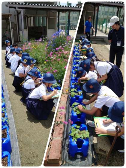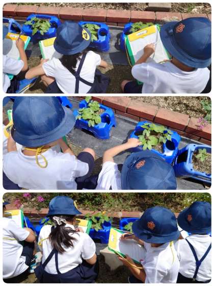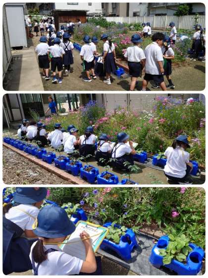 1年生が育てているアサガオがぐんぐん成長してきました。本葉が何枚も出てきています。自分のアサガオの葉っぱをよく観察してカードに絵を描いていました。葉っぱの形は少し難しいですが、特徴をとらえてがんばって描いていましたよ。