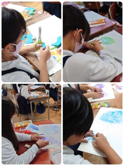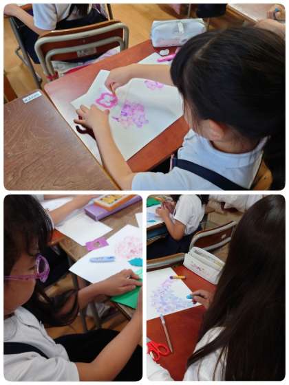 紙で型を切り抜いて、縁をクレパスで塗って、画用紙の上にその型を置いて、そして指の腹を使ってクレパスを広げていきます。何回か繰り返すうちにきれいなアジサイができあがりました。緑色の画用紙で葉っぱも作り貼りました。また空いているスペースに絵をどんどん描き込んでいくと、とてもステキな6月の風景ができあがっていきます。子ども達は自分の作品がすごく気に入ったようで、うれしそうに絵の説明をしてくれます。そんな子ども達のお話を聞いていると、1枚の絵にたくさんお話がつまっているなと感心します。子ども達の想像力はすごいですね。