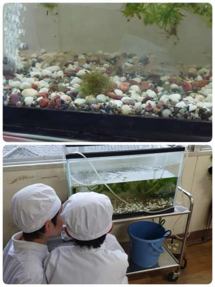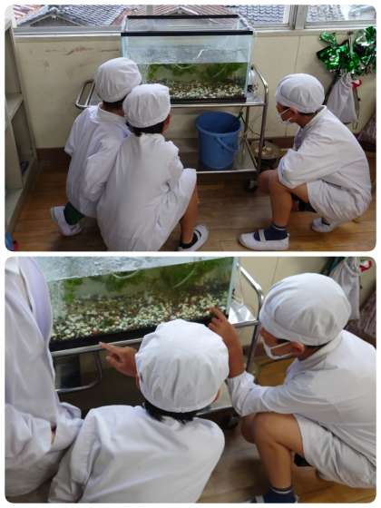 給食の準備の時間に、学習園のビオトープですくってきたメダカの観察をしていました。写真ではわかりにくいですが、まるまるしていてとても立派なメダカです。オス・メスの見分け方や卵の収穫、受精卵の観察などの学習をしていきます。