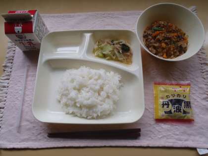6月6日(火)今日の給食の献立は、「ごはん 牛乳 マーボーはるさめ チンゲンサイともやしの甘酢あえ いり黒豆」です。
