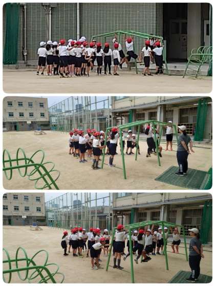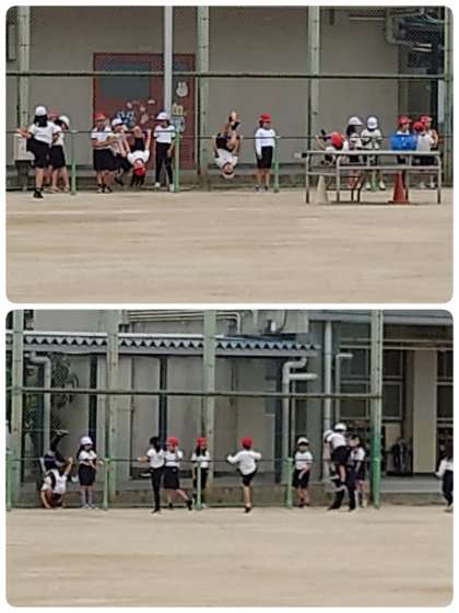 体育の時間にうんていを使って陣地取りゲームを楽しんでいました。うんていをしている子は少しでも速く前に進めるように必死です。まわりの子達の応援がすごかったです。その後は鉄棒運動をしていました。いつもみんなで体育を楽しんでいる3年1組です。