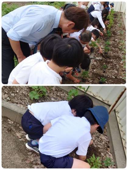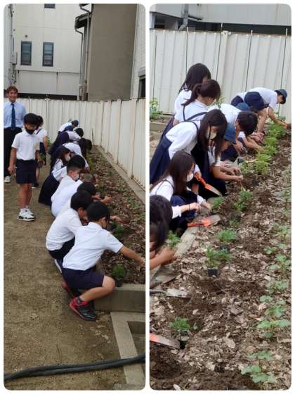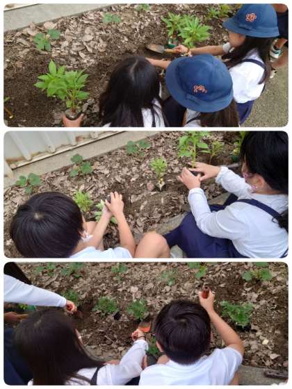 小さなポットで育てていたマリーゴールドとホウセンカの苗を学習園に植え替えました。とても立派な苗で、順調に育てていくと理科の実験に活かすことができます。みんなでしっかりお世話をしてね。