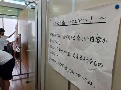 今日の2時間めに、歯科検診を行いました。友だちが歯科検診を受けている間、一方では隣の部屋で「歯っピーフェア」として、虫歯の進み方や他の動物との歯の違い、歯間ブラシの使い方について考えました。掲示物を見たり触ったりしていて、子どもたちはとても興味を示していました。