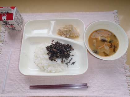 6月8日(木)今日の給食の献立は、「ごはん 牛乳 鶏肉のおろしじょうゆかけ みそ汁 魚ひじきそぼろ」です。