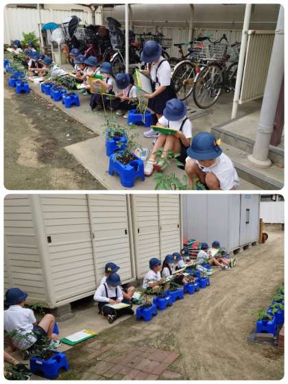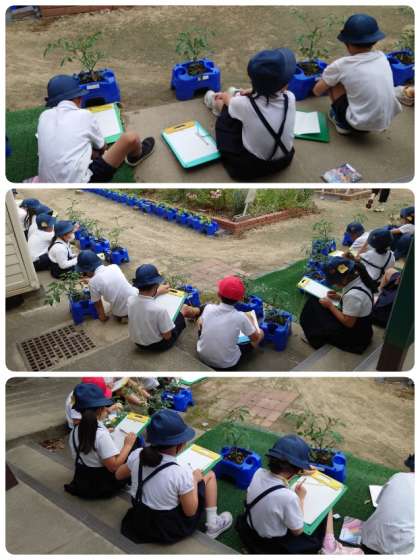 大きく元気に育ってきたミニトマトの観察をしました。葉っぱの色も濃い緑で、日に日に成長しています。2年生の子ども達も自分のトマトの様子をしっかり見て観察カードにかいていました。