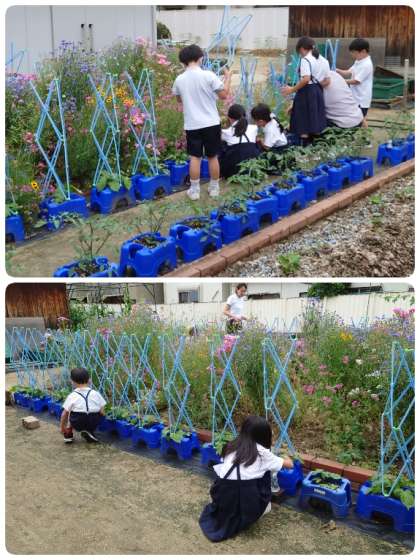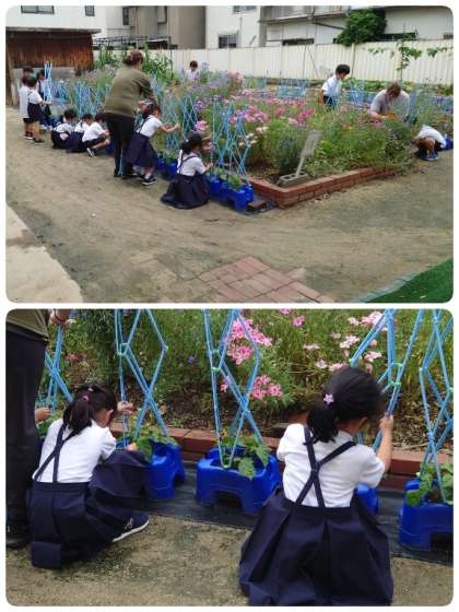 アサガオの本葉が大きくなってきたので、今日は支柱を立てました。