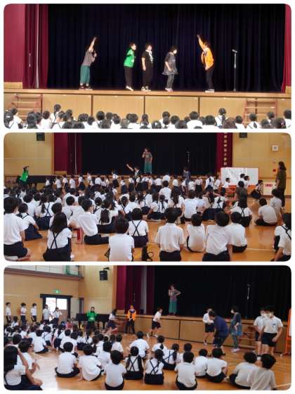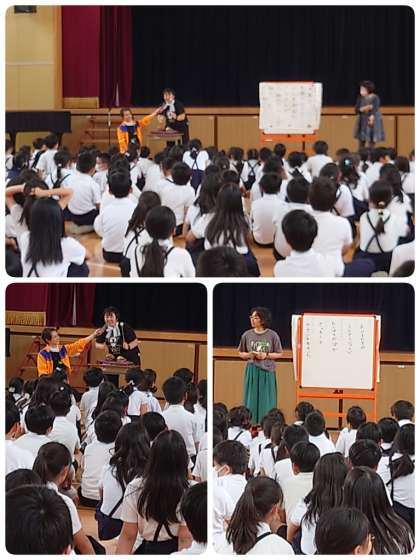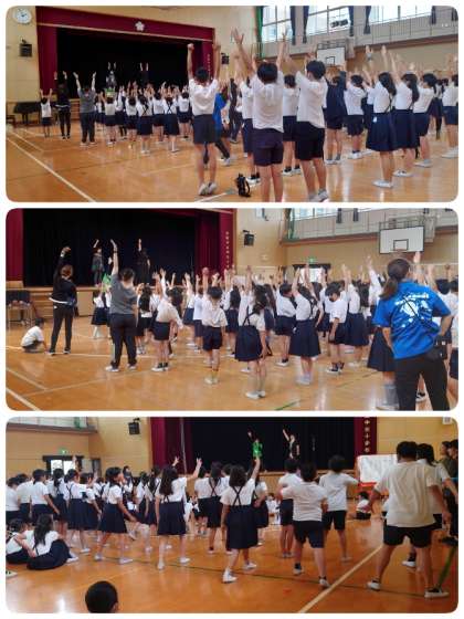 6月27日の芸術鑑賞会に向けて、ワークショップがありました。5時間目は全学年でウォーミングアップをしてからゲームを楽しみました。中でも学年ごとにしたエアー長縄跳びは見ごたえがありました。1・2年生は一斉跳びで、3年生以上は8の字跳びをしましたが、本物の縄があるみたいにみんな跳んでいました。木魚のリズムに合わせて歌も一緒に歌いました。楽しい1時間はあっという間。今から本番がとっても楽しみです。