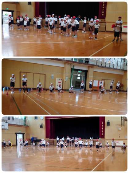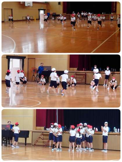 3時間目に1・2年生がシャトルランにトライしました。測定は難しいので6年生がお手伝い。1・2年生ははりきって走りました。音に合わせて最初はゆっくりというのが1・2年生には難しいですが、6年生がいろいろ声をかけてくれるのでペースが安定していきました。走り終わったら6年生が「がんばったね。」の拍手をしてくれました。その後も水分補給をするように一緒に水筒の置いてあるところまで連れていってくれました。がんばった1・2年生に拍手!とっても優しい6年生に拍手!!です。