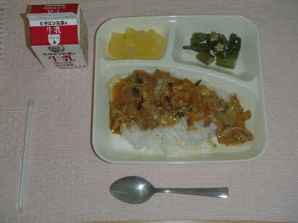 6月20日(火)今日の給食の献立は、「和風カレー丼 牛乳 オクラのかつお梅風味 りんご(カット缶)」です。
