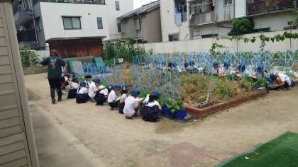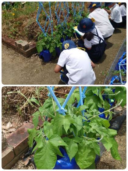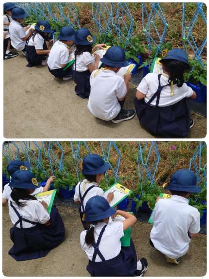 定期的にアサガオの観察カードをかいている1年生。今日も大きくなってきた葉っぱの形やツルが伸びてきた様子、葉っぱや茎にはえている毛など、しっかり観察してカードにかきこんでいました。どうしてアサガオの葉や茎などに毛が生えているのかといえば「虫よけ」だそうです。