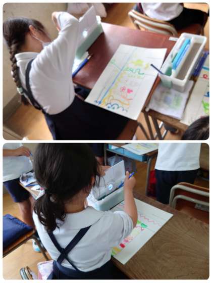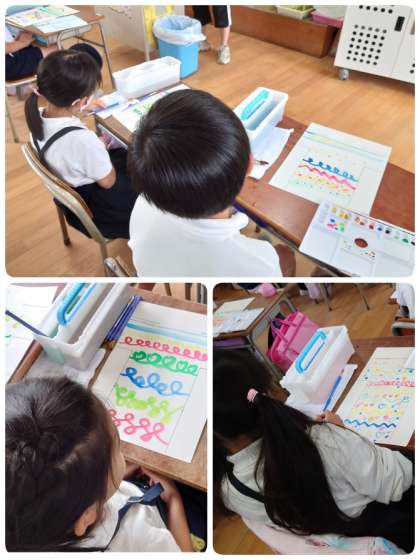 2年生は、今日初めて絵の具の使い方の学習をしました。パレットの小さいお部屋に少しずつ絵の具を入れます。水入れの筆を洗うところ・すすぐところ・絵の具をとくときに使う水のところに分けて使うことも教えてもらいました。きれいな絵の具の色を使って画用紙にいろいろな線を描いてみました。きれいな色でいろんな線を描くことができたので、満足した表情をしていました。