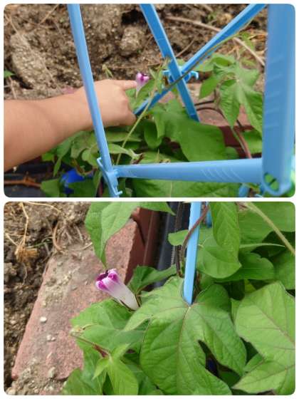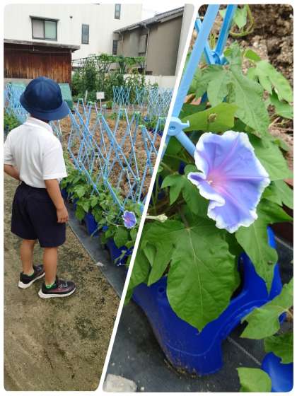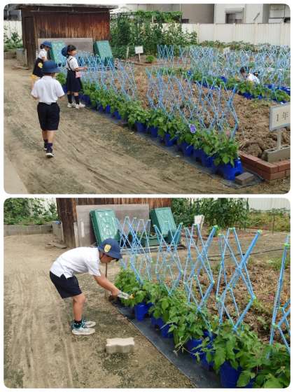 1年生が育てているアサガオが咲き始めました。すごく大きな花でびっくりです。「いいなぁ。早く咲いてほしいなぁ。」とつぶやいている子がいました。水やりをしながら自分のアサガオにも花が咲いていることに気づいた子もいました。これからいろいろな色のアサガオが次々と咲いていきます。子ども達も毎日の観察が楽しみですね。