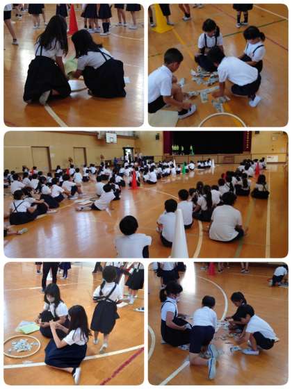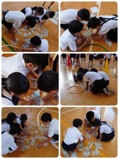 ふくろの中に入っているバラバラになった新聞紙をセロハンテープでくっつけて元に戻すゲームです。きょうだい学年(5・3年、4・2年、6・1年)で1分ずつ順番に交代して行いました。完成したら音楽に合わせてダンスをしました。運動会の時に5・6年が踊ったダンスです。他の学年の子ども達も全員踊っていたのでびっくり!!覚えているんですね。