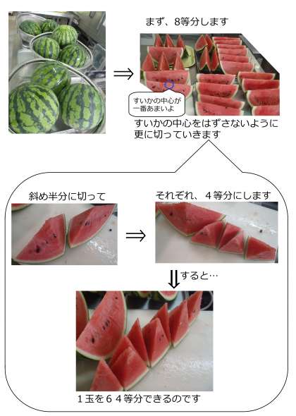 給食のスイカはみんな同じに甘さになるように切っています。
