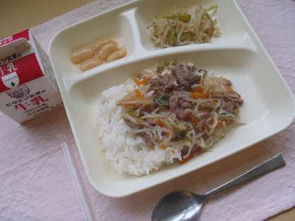 給食の牛丼は、一般のものと比べて少し薄い色です。どんな材料が使われているか、よく見えるようにするためです。今日の牛丼は、にんじんと青ねぎが彩りよく入っています。