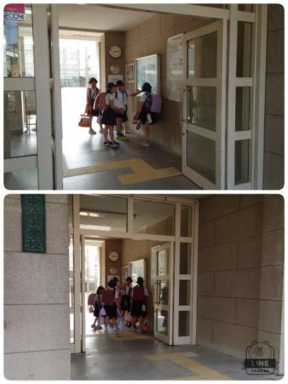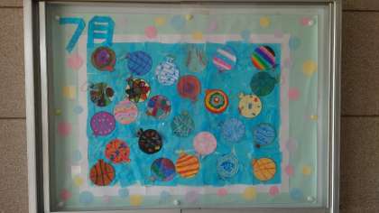 7月の玄関掲示は3年生の作品です。思い思いのヨーヨーを描きました。いろんな模様のヨーヨーができあがりました。期末懇談会の時に見てください。