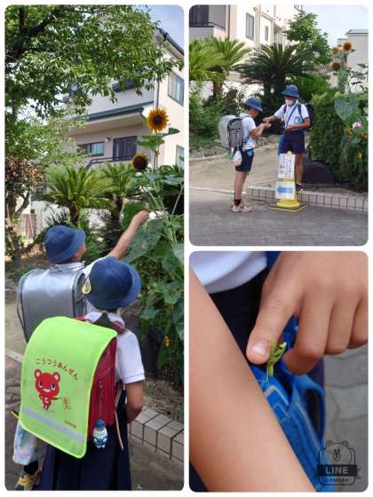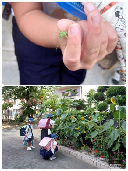 毎朝のように登校してきた子ども達が、ヒマワリをじっと見てカマキリを探しています。今日は2匹見つかりました。まだ小さいですが、とてもすばしっこいです。大事に育ててね!
