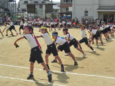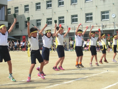 3・4年生の団体演技は、「百代目 N(Nakahama) Soul Brothers」です。1曲目は三代目J Soul Brothersの「STORM RIDER feat SLASH」、2曲目はE-girlsの「Anniversary」で、鳴子(なるこ)をもって曲に合わせてキレッキレにカッコよく踊りました。鳴子の音を揃え、隊形の変化をしていくのは難しそうでしたが、楽しそうに踊っていました。