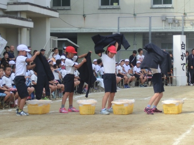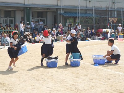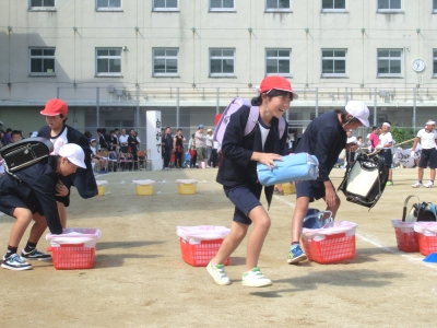 4年生の個人走は、トラックでの単なる80m走ではなく、4つのポイントをまわりながら「メッセンジャー」となって走ります。小学校制服の上着を着て、ランドセルを背負い、絵の具かばん、習字道具かばんを持って走り、最後はすべてをかごに入れてゴールをします。いくら走る力があっても、1等にはなれないようでした。