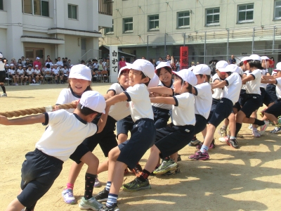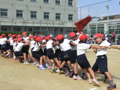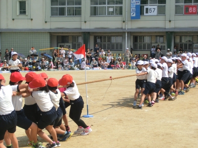 午前の部の最後の競技は、全学年による「紅白対抗なかよし綱引き」でした。赤組・白組全員が3班に分かれて、綱引きを3回戦行いました。得点競技でもあるので、応援は必死でした。